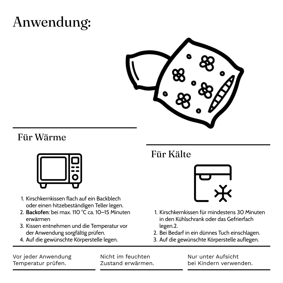 By heating it in the oven (simply heat the pillow in the oven preheated to a maximum of 110 °C for approx. 15 minutes and feel the relaxing effect of the cherry stones), the cherry stone pillow becomes a pleasant source of heat that can be placed in a targeted manner.